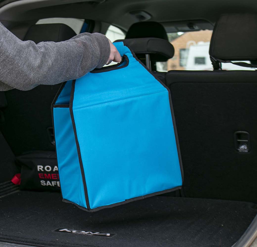 storing easily underneath car seats or in-between the console and seat. The canvas material makes for a strong and durable product that will last through several of your trips to the store, to the beach or